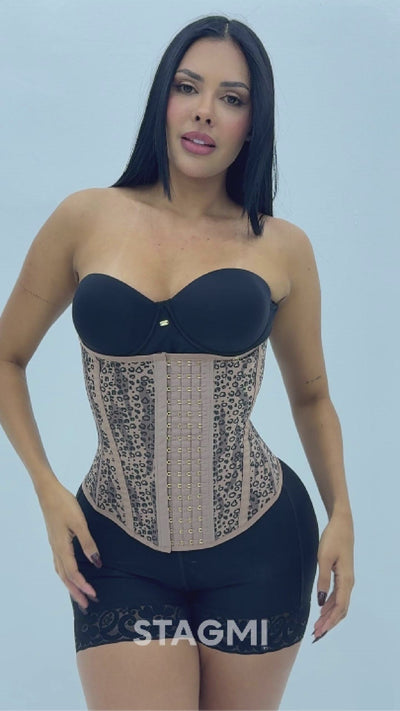 Cinturilla de silueta tradicional, con pretina alta, abrochadura frontal de 4 niveles, estructura con varillas frontales, laterales y posteriores. Estampado animal print exclusivo y sesgos en color cocoa que realzan visualmente su diseño. Cómoda, elegante y funcional.