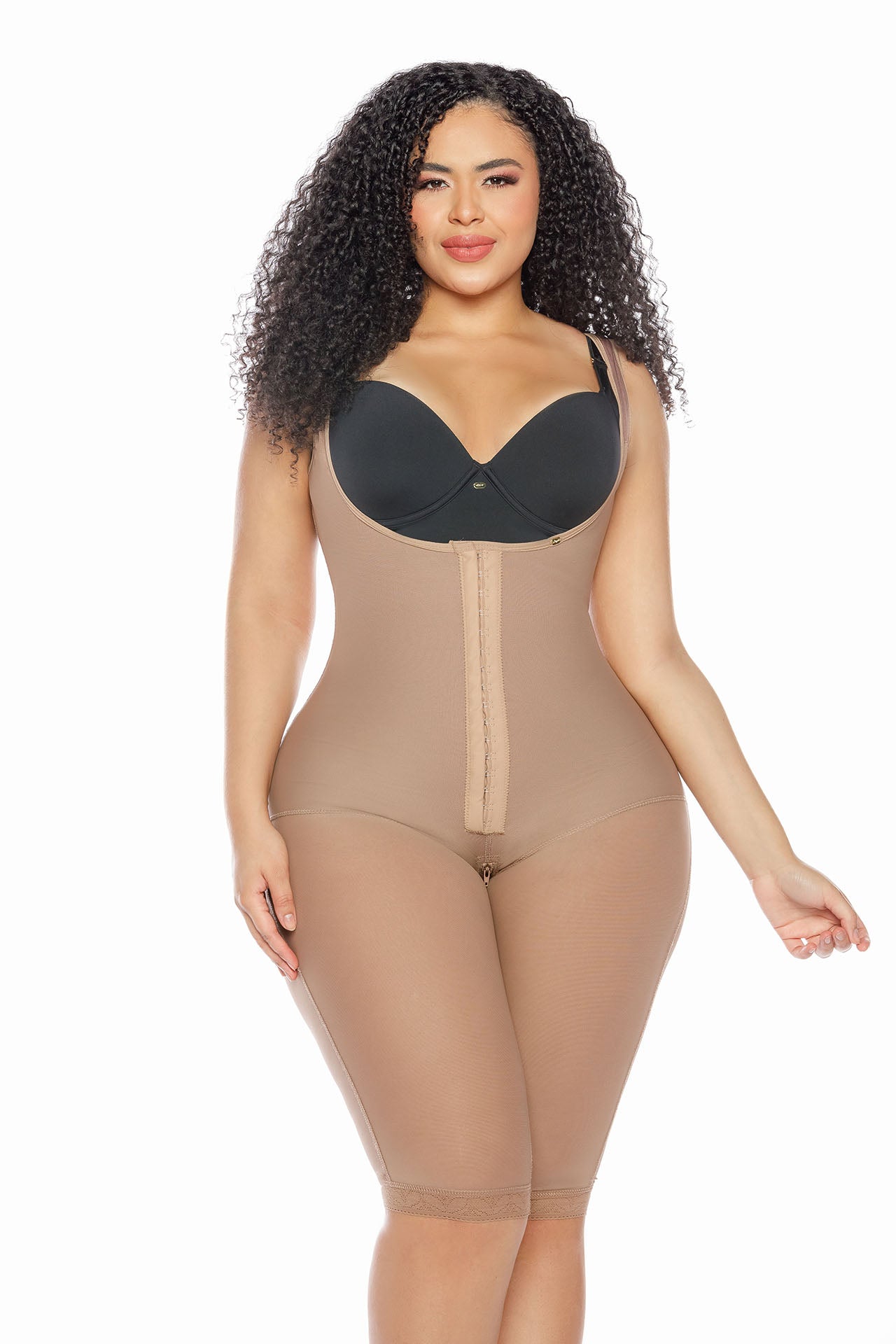 Faja larga de alta compresión con broche frontal y pierna tipo biker en tul powernet. Realza la figura, define cintura y abdomen, y moldea piernas sin marcarse bajo la ropa. Diseño con busto libre y terminaciones con encaje siliconado para máximo ajuste y discreción.
