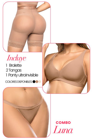 Este combo incluye 3 productos a un increíble precio: 1 panty ultra invisible + 1 bra o top seamless + 1 panty moldeador complementario.