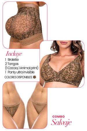 Combo Salvaje – Set de 4 Piezas | Bralette + 2 Tangas (Cocoa & Animal Print) + 1 Panty Ultrainvisible