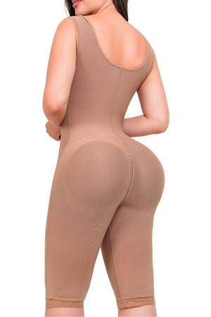 Faja larga hasta la rodilla con compresión uniforme en abdomen, caderas y piernas. Su diseño ergonómico la hace perfecta para cuerpos con mayor volumen en la parte inferior, ofreciendo soporte sin limitar la movilidad. Ideal para reducir tallas con el uso continuo.